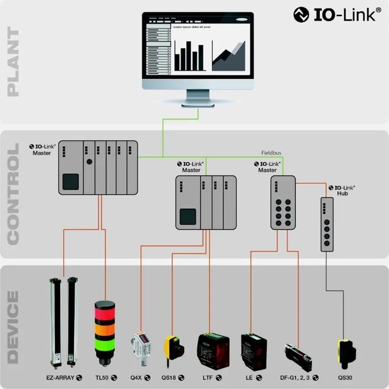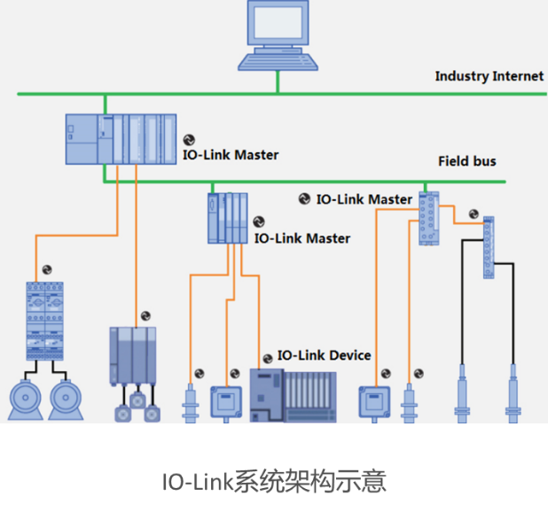 在工廠自動化功能網絡中,IO-Link通訊位于執行層(包括各類傳感器和執行器)和現場層之間,負責設備和主站間的信息交換,同時,IO-Link主站作為執行層和現場控制層實現信息傳輸的網關,真正實現了將IO-Link設備接入現場總線/工業互聯網,進行傳感器級的網絡管理和控制。