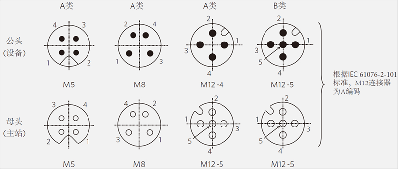 每個IO-Link設備都要連接到IO-Link主站的一個通道上,因此,IO-Link是點對點的通信協議,而不是總線協議。IO-Link設備分為傳感器和執行器,前者通常是4針M8或M12接口,后者通常是5針M12接口。IO-Link設備針腳定義如下:
