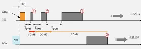當主站首次與設備通訊或需要配置時,主站會發送1個喚醒請求,喚醒周期通常為80 us(最小值75 us,最大值85 us)。主站提供(或吸收)電流以生成喚醒脈沖,如果線路為低電平,主站將提供電流以將其拉高,反之亦然,喚醒請求通過至少500 mA的電流脈沖將C/Q線短接80 us,設備必須在500 us(TREN)內準備好進行通訊,IO-Link設備通過電路上電壓變化來檢測喚醒脈沖。收到喚醒請求后,IO-Link設備必須將自身配置為接收模式,該過程必須在500 us內完成。